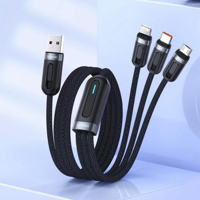 • Three connectors in one cable — USB-C, Lightning, and Micro USB for universal compatibility.